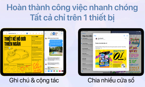 Màn hình 10.9 inch Liquid Retina hiển thị màu sắc chính xác, góc nhìn rộng. Thiết kế all-screen, USB-C, hỗ trợ Apple Pencil. Trải nghiệm xem phim, đọc sách và ghi chú trên iPad cực kỳ thoải mái.